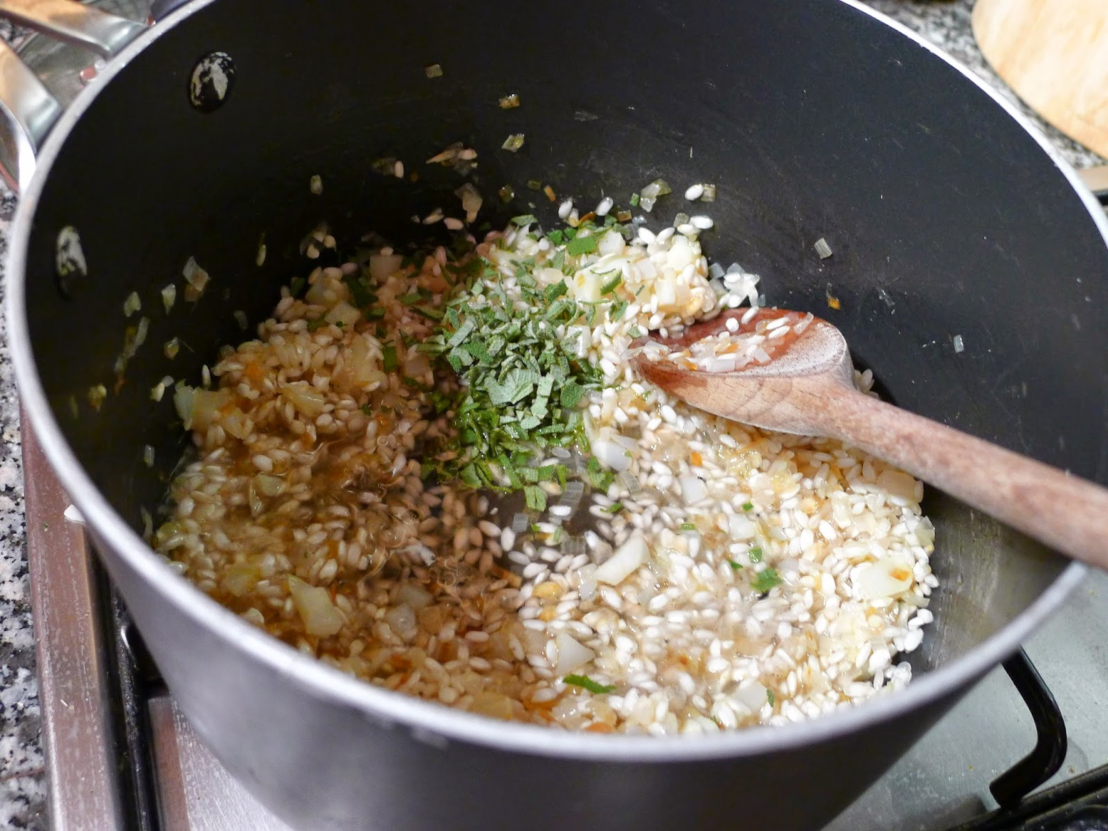 Turn the heat up a little and tip in the rice. Stir around to coat for a minute or so before adding the sherry. Finely chop the remaining sage and throw that in too.